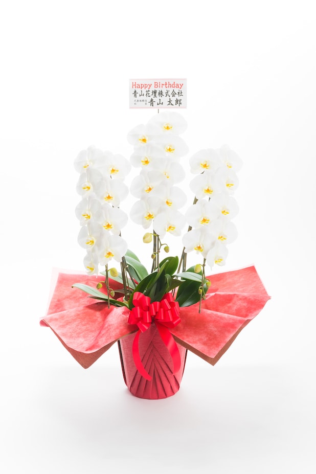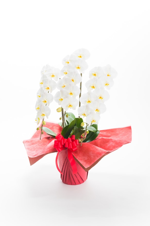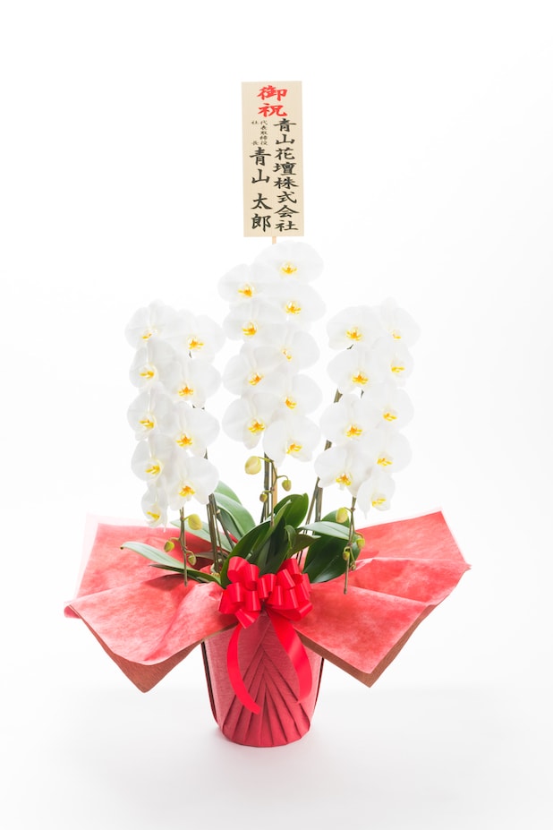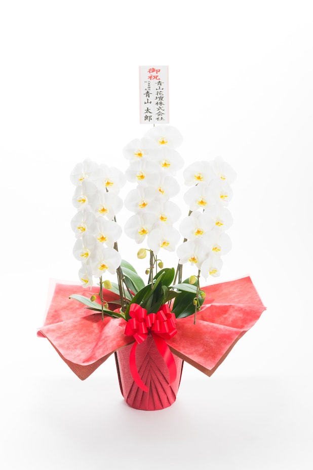 開業祝い・開店祝いに最もよくご注文をいただきます。人気のあるサイズの大輪胡蝶蘭3本立です。