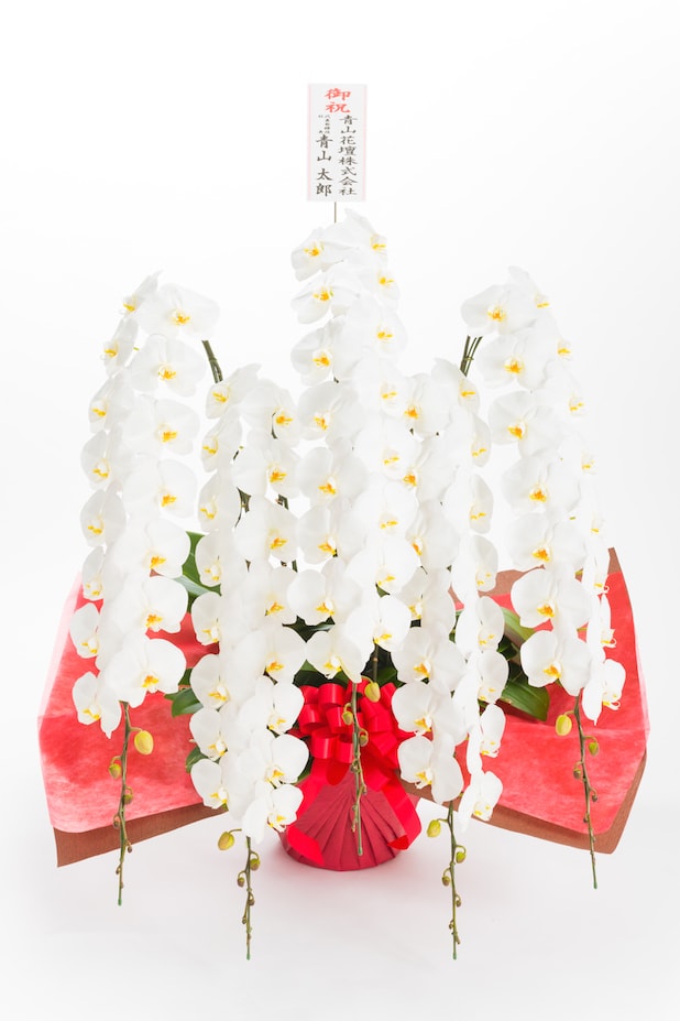 通常のお取り扱いはほとんどない、最高クラス・特大サイズの5本立て。どこに贈られても極めて目立ちます。最高級胡蝶蘭は必ず喜んで頂ける一鉢です。